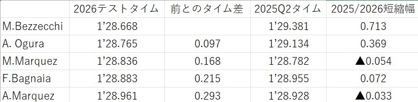 二日間のテストで最速タイムを記録したのは、マルコ・ベッツェッキ(Aprilia Racing)の1’28.668。2番手がアプリリアサテライトの小椋藍(Trackhouse Racing Team)で1’28.765、3番手のマルク・マルケス(Ducati Lenovo Team)は1’28.836。4番手にペコ・バニャイア(Ducati Lenovo Team)の1’28.883。5番手がアレックス・マルケス(BK8 Gresini Racing MotoGP)で1’28.961。ちなみに、昨年の開幕戦予選トップ5はポールポジションから順に、マルク・マルケスー1’28.782、アレックス・マルケスー1’28.928、ペコ・バニャイアー1’28.955、ジャック・ミラーー1’29.090、小椋藍ー1’29.134、という順でした。今回のテストで最速だったベズは開幕戦予選9番手で、タイムは1’29.381。テスト上位5選手が記録した一発タイムの昨年からの伸び幅を比較してみると、以下のようになります。